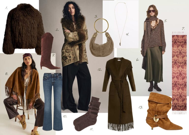 Something I noticed as I share all these pieces is that once you start bundling up with coats and boots, the line between boho and western gets a little fuzzy. Suede and fringe can go either way, but I do feel there is a bit more feminine energy in the bohemian looks. Messy, loose Stevie Nicks curls, Moroccan tapestry patterns, long gold necklaces, and a head-turning brown boot. That’s a winter look to get behind. The key is also the accessories. The head scarves, the big-throw-over-your-shoulder scarves, and hobo bags that you can hold in your hand (because nothing is more annoying than a shoulder bag constantly falling off your shoulder because it’s over a giant coat). And if you are team sunglasses year-round, you can always wear your favorite pair. I’m really obsessed with this look that features jacket #2; everything about it is beautiful. I also love this sweater (#5) and the slip dress underneath (#6), but I personally wouldn’t style it together. I would have done jeans with that sweater and then the brown shearling coat (#1) with the slip dress. And I think that dress needs a pair of heels. The price range for this wishlist is all over the place, so there is something for everyone, or maybe one or two things to ask a loved one next month *wink*.